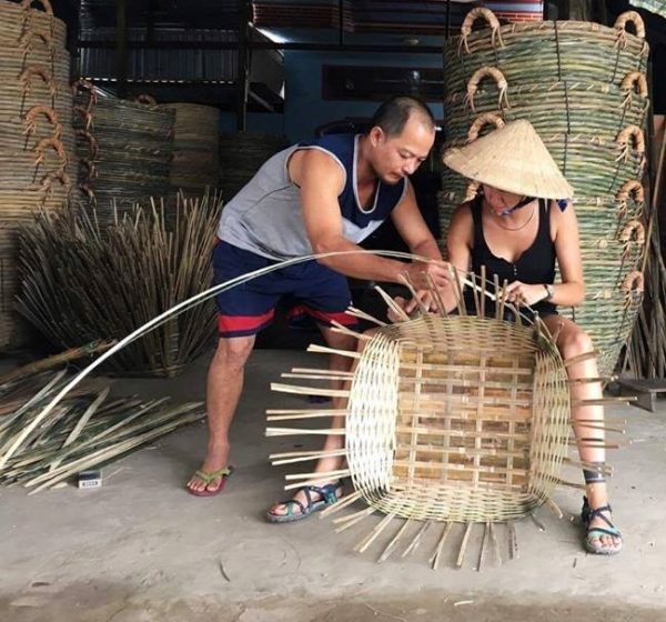 Chez notre ami fabriquant de paniers tressés en bambous au bord du fleuve. Savoir-faire familial depuis plus de 50 ans.